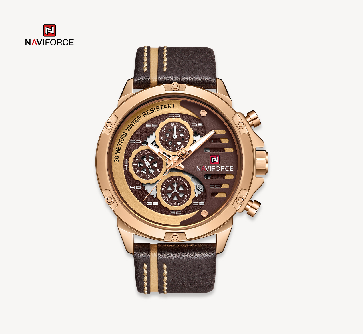 ساعت Naviforce 9110 با سه موتور فعال، عملکردی بالا و دقیق را به شما ارائه می دهد. این ساعت دارای روزشمار، نمایش روزهای هفته و نمایش ساعت بصورت ۲۴ ساعته است که برای افراد پر مشغله بسیار مفید است.