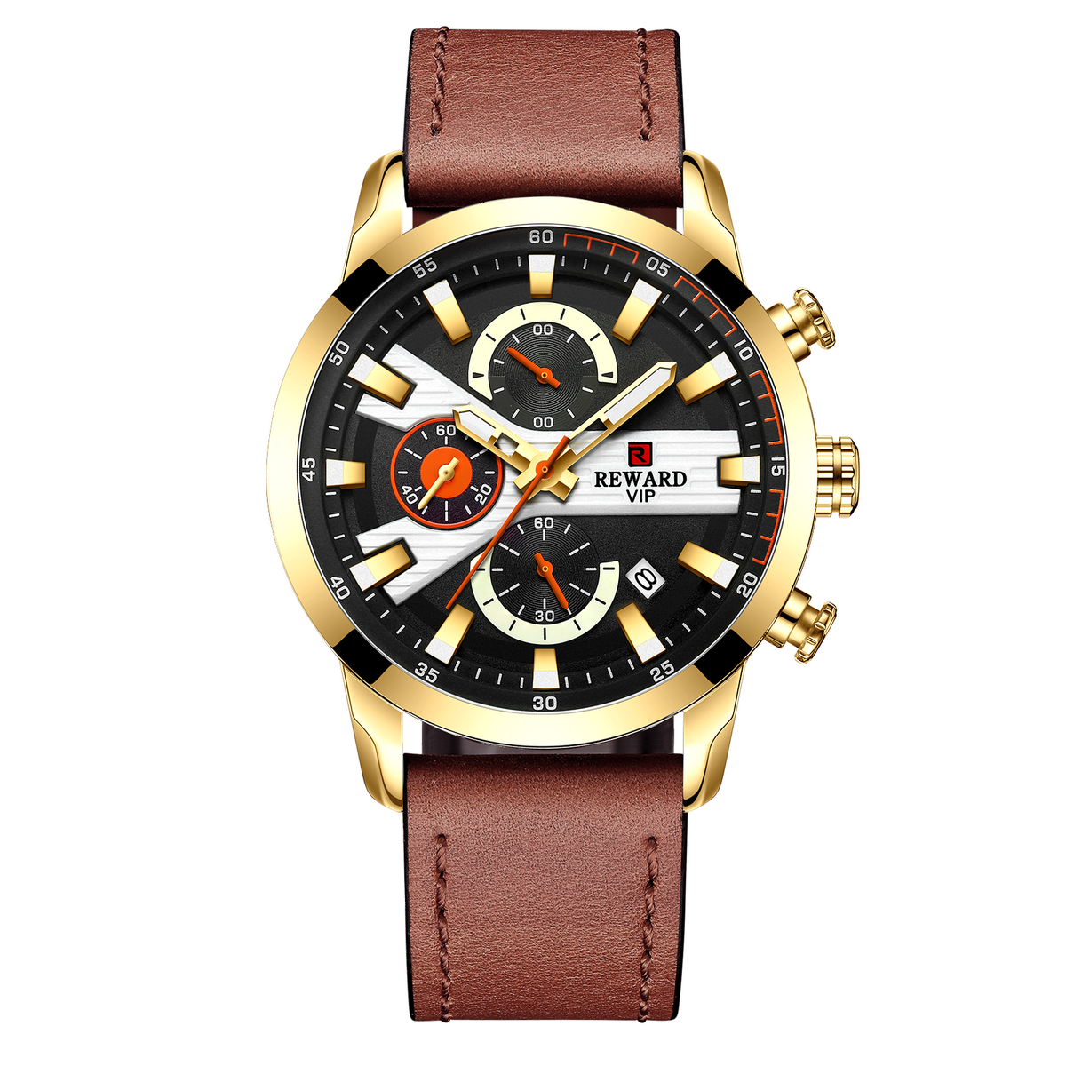 REWARD 83010 با طراحی شیک و مدرن خود، چشم هر بیننده ای را به خود جلب می کند. این ساعت با قاب استیل ضد زنگ و بند چرمی درجه یک، ظاهری لوکس و مناسب برای هر سبکی از پوشش را به شما ارائه می دهد.